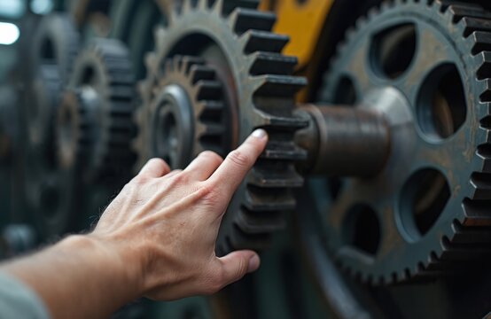 Hand resting on grey metal gear of moving machinery. Close-up view of gear intricate details. Machinery blurred background, emphasizing gear industrial design, safety risk, entrapment danger.