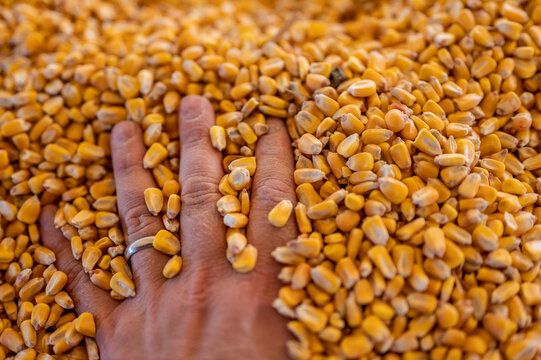Hand buried and entrapped in the top layer of corn in a grain storage bin.