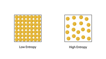 Vector scientific illustration of low entropy and high entropy isolated on white background. Entropy is a state of disorder or randomness. A concept used in physics and chemistry in thermodynamics.