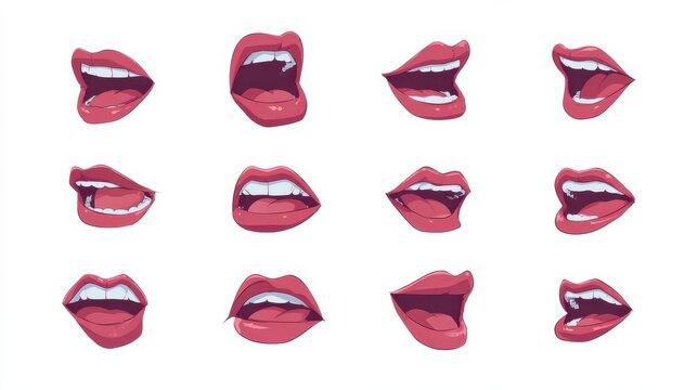 Cartoon talking mouth and lips expressions vector animations poses. Accent and pronunciation speak, tongue and articulate illustration, no logos, no brands