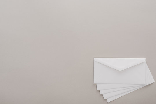 Blank white envelopes and stationery mockups on a light gray surface. Mockups of various sizes and types of stationery items for branding and design presentation.