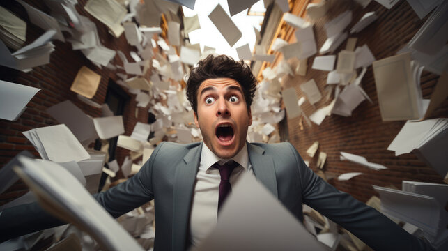 A busy businessman looking stressed envelopes are circling above him attacking him.