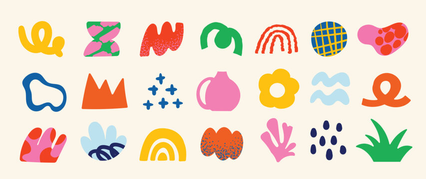 Set of abstract retro organic shapes vector. Collection of contemporary figure, flower, leaf, vase, mountain in funky groovy style. Cute hippie design element perfect for banner, print, stickers.
