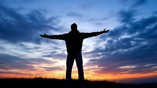 A woman stands in a field at sunset, triumphantly breaking chains overhead with raised arms, symbolizing freedom and empowerment