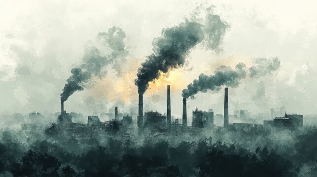Industrial Air Pollution - Factory Chimneys Emitting Smoke in Watercolor Style under Gray Sky