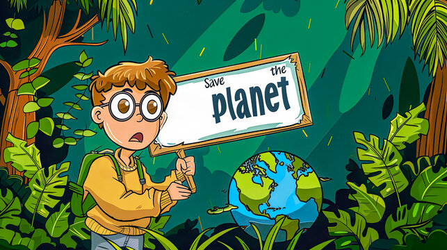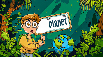 Cartoon of a worried boy holding a save the planet sign amidst a lush forest backdrop