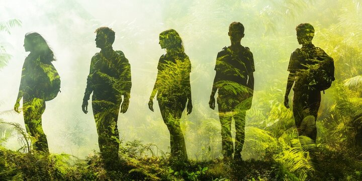 Silhouettes of diverse people with lush forest backdrop symbolize sustainability, eco-friendly business, and environmental unity
