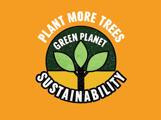 illustration and text. Plant More Trees, Green Planet, Sustainability, on yellow background. Perfect for environment, nature concepts.