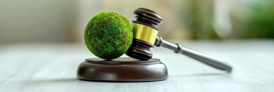 A hammer of a judge next to the green planet Earth, the concept of sustainable development and environmental protection