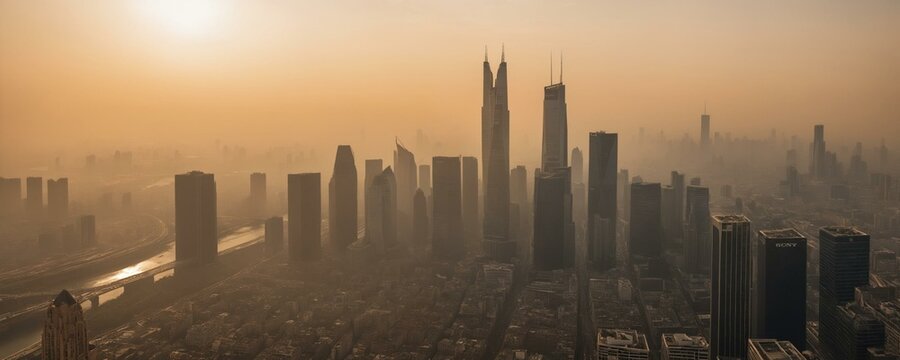 Smoggy Sunset over Shanghai Skyline: Dramatic Cityscape