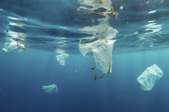 Turtle among plastic and garbage pollution in the ocean. Packages and bottles in water. Problems of environmental ecology.