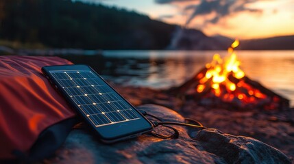 Smartphones charging on a portable solar panel near a glowing campfire at twilight, blending technology and nature.