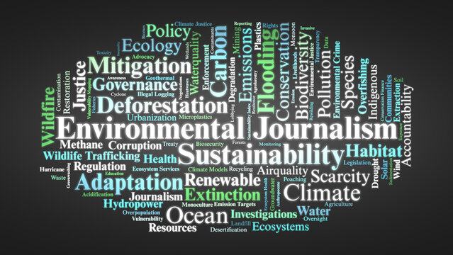 Environmental Journalism Word Cloud. Core Terms On Climate, Ecosystems, Justice, And Global Sustainability.