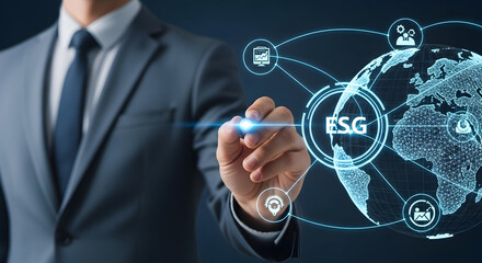 Man touches global ESG icon, showing environmental strategy, social responsibility, background technology