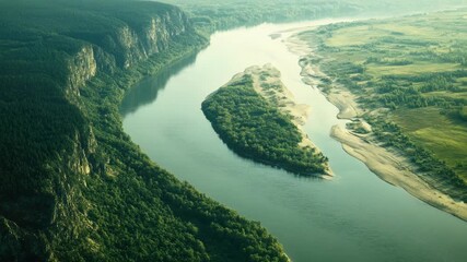 Lush forest with a winding river, emphasizing natural scenery for environmental or outdoor design purposes