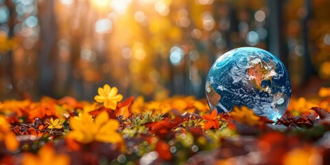 Autumn nature scenery with globe and fallen leaves. Environmental concept of changing seasons and planet Earth preservation.