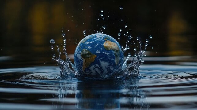 A symbolic representation of Earth emerging from water with splashes, highlighting environmental themes and global nature.