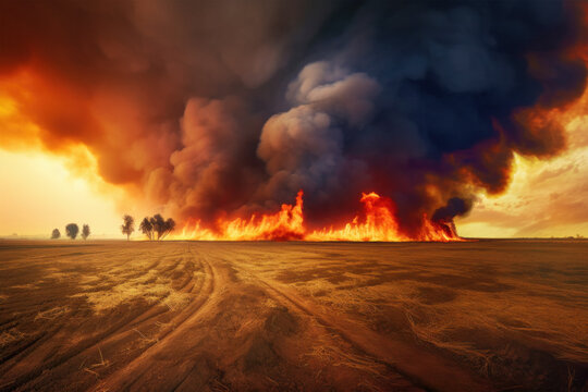 Amidst smoke and flames, a vivid fireline closes in on a lush green forest, showcasing the conflict between nature and wildfire. The untouched zone faces a critical environmental threat today