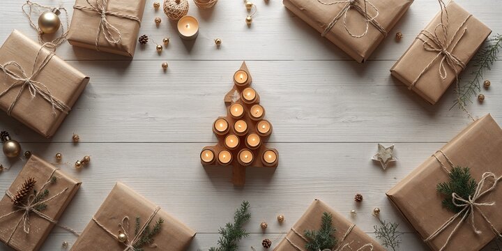 Flat Scandinavian style Christmas gift wrapping focused on minimalistic and environmentally conscious packaging methods
