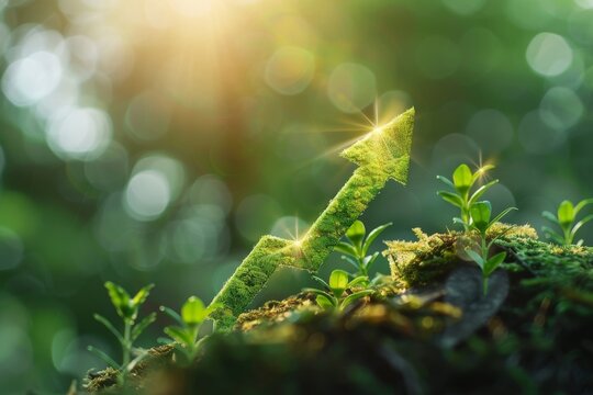 Green Tech Interface: Person in denim uses a laptop with icons like a plant-light bulb, recycling symbol, and leafy house, emphasizing eco-friendly initiatives.