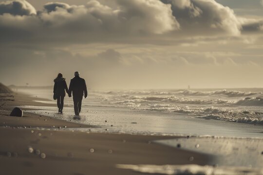 Couple walks on beach listening to music, enjoying sound of waves - canon eos 5d mark iv photo