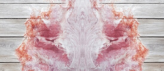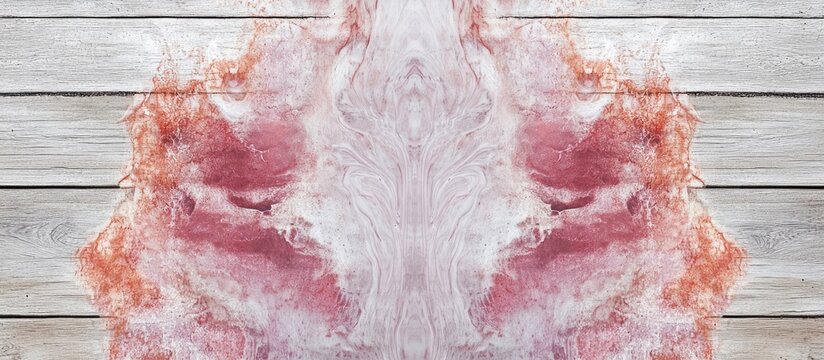 Close-up detail of epidermal nevi resembling Rorschach inkblot test on skin against a light wooden backdrop with space for text and soft red tones