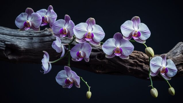 Close-up shot of flowering tropical epiphytic orchid species resting on wood with a black backdrop