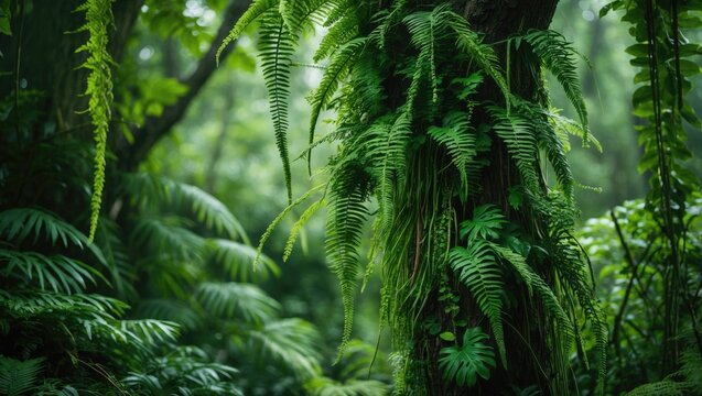A tree trunk in a lush jungle covered by epiphytic ferns and various other plants, Phuket, Thailand