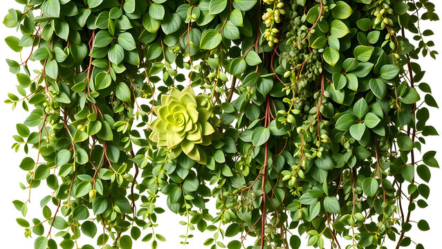 Lush green succulent leaves mixed with hanging vines, ivy, and epiphytic plants, cascading naturally in a decorative arrangement.