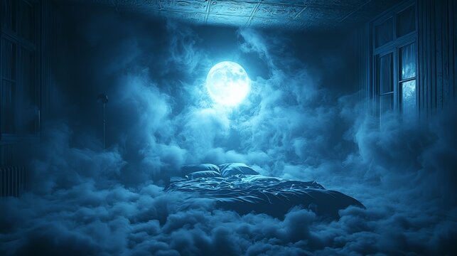 Darkened room with a sleeper gasping for breath the air being visually pulled away creating a sense of panic as they experience a sleep apnea episode lit only by a faint moon