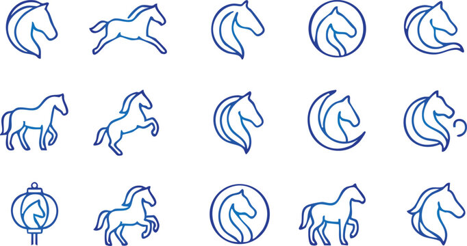 A collection of fifteen minimalist black line art horse icons in various poses and styles ideal for design projects on transparent background
