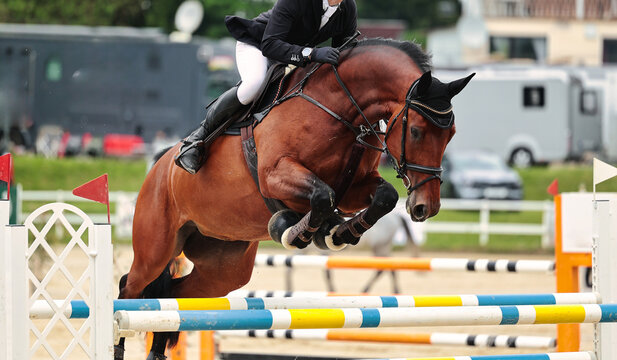 Un jinete salta con su caballo un obstáculo en una competición hípica de salto.