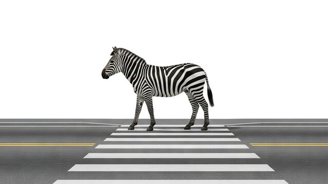 Zebra strides across a pedestrian crossing on an asphalt road with yellow lines against a bright white background