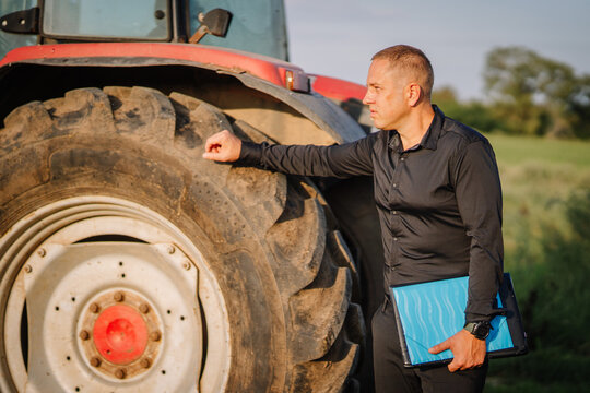 Valmiera, Latvia - August 17, 2024 - A man stands beside a tractor tire in a field, holding a clipboard and examining the tire.