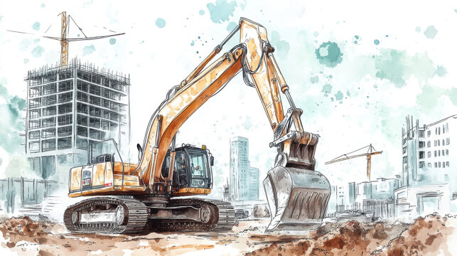 A detailed illustration of an excavator working on a construction site with buildings in the background, showcasing the machinery in action.