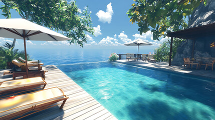 Relaxing by the pool during summer vacation, with a veranda equipped with deck chairs and an umbrella, all overlooking the ocean
