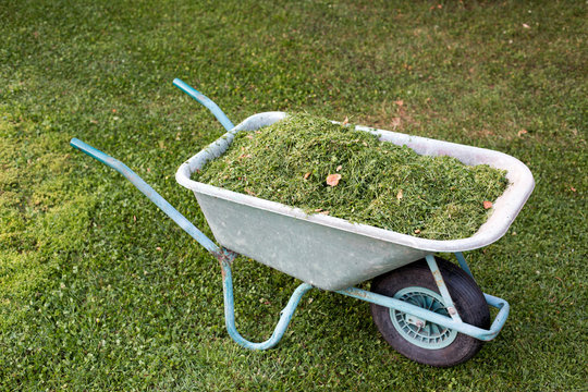 Carriola piena di erba tagliata vista dall'alto