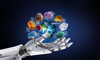 A detailed illustration of rare earth minerals in their raw form, with elements such as promethium