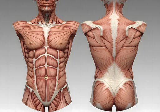 Anatomical rendering of the human torso, showcasing the musculature of the front and back with detailed definition of the abdominal muscles and spinal erectors.