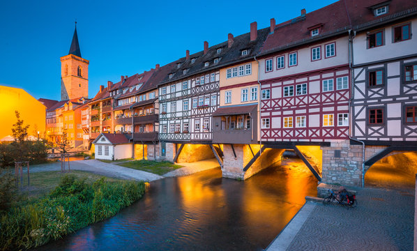 Historic city center of Erfurt with famous Krämerbrücke bridge illuminated at twilight, Thüringen, Germany