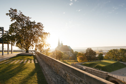 Sonnenaufgang an der Zitadelle auf dem Petersberg in Erfurt mit Blick auf den Dom
