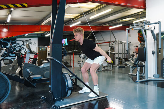 Full length shot of a young sportsman doing a crossfit workout on a ski erg machine at the gym