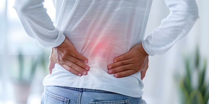 Man in discomfort, holds lower back, signifying back pain and healthcare concern