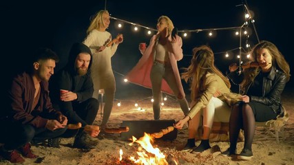 girl seduces guys with erotic dances at evening picnic and broil sausages, friends at camping party