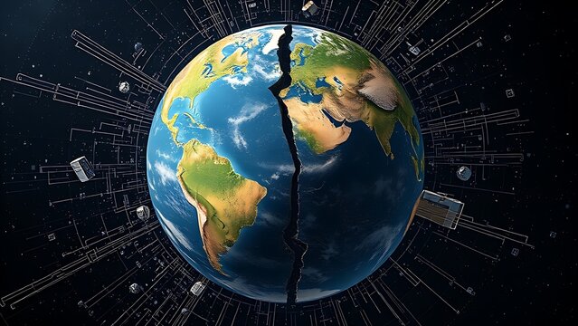 Fractured globe with mismatched seasonal quadrants spinning chaotically amid erratic satellite data.