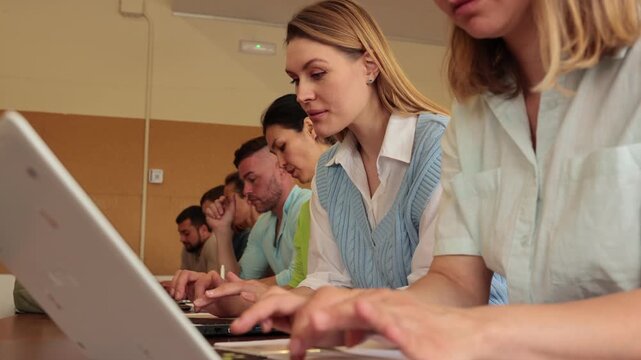 Group of students studying in the auditorium at study time, searches for information on a laptop and writes it out in a copybooks.