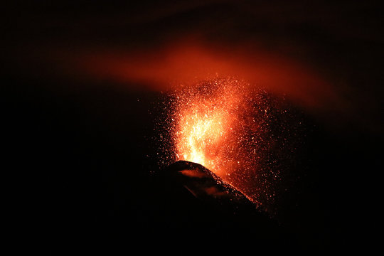 Reventador Volcano erupting at dawn, September 2016. The mountain is situated in a remote part of the Ecuadorian Amazon surrounded by rainforest.
