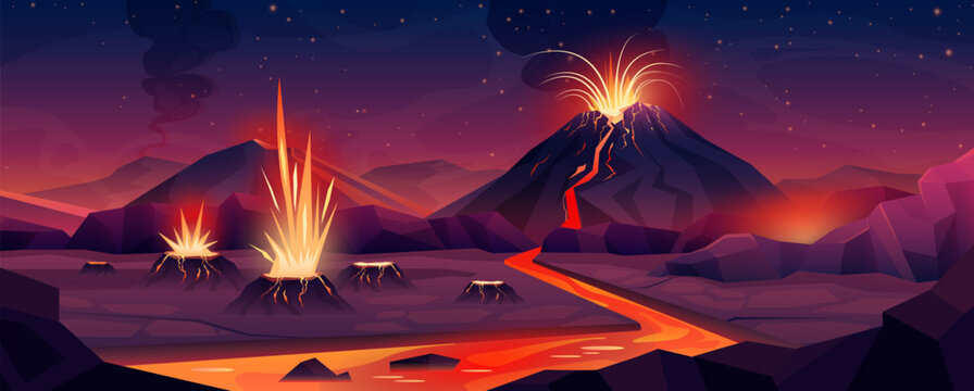 Volcano eruption on alien planet. Crazy red and golden streams of hot lava and magma erupt from craters of volcano, fantasy river of fire flowing over rocky surface cartoon vector illustration