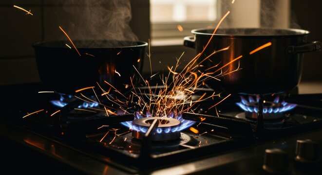 Sparks erupt from a gas stove with pots on the burners, creating a dramatic kitchen scene.