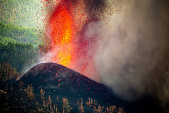 Volcano eruption near forest in nature